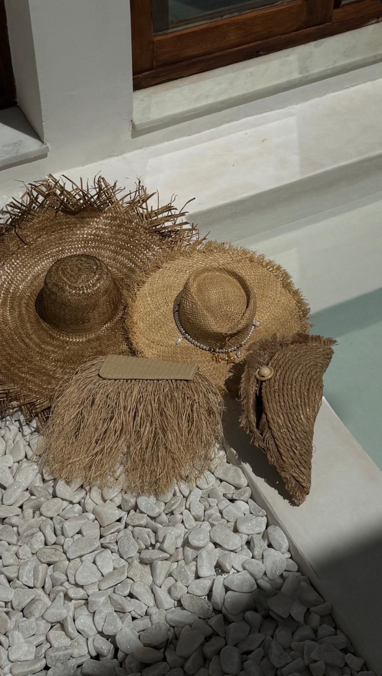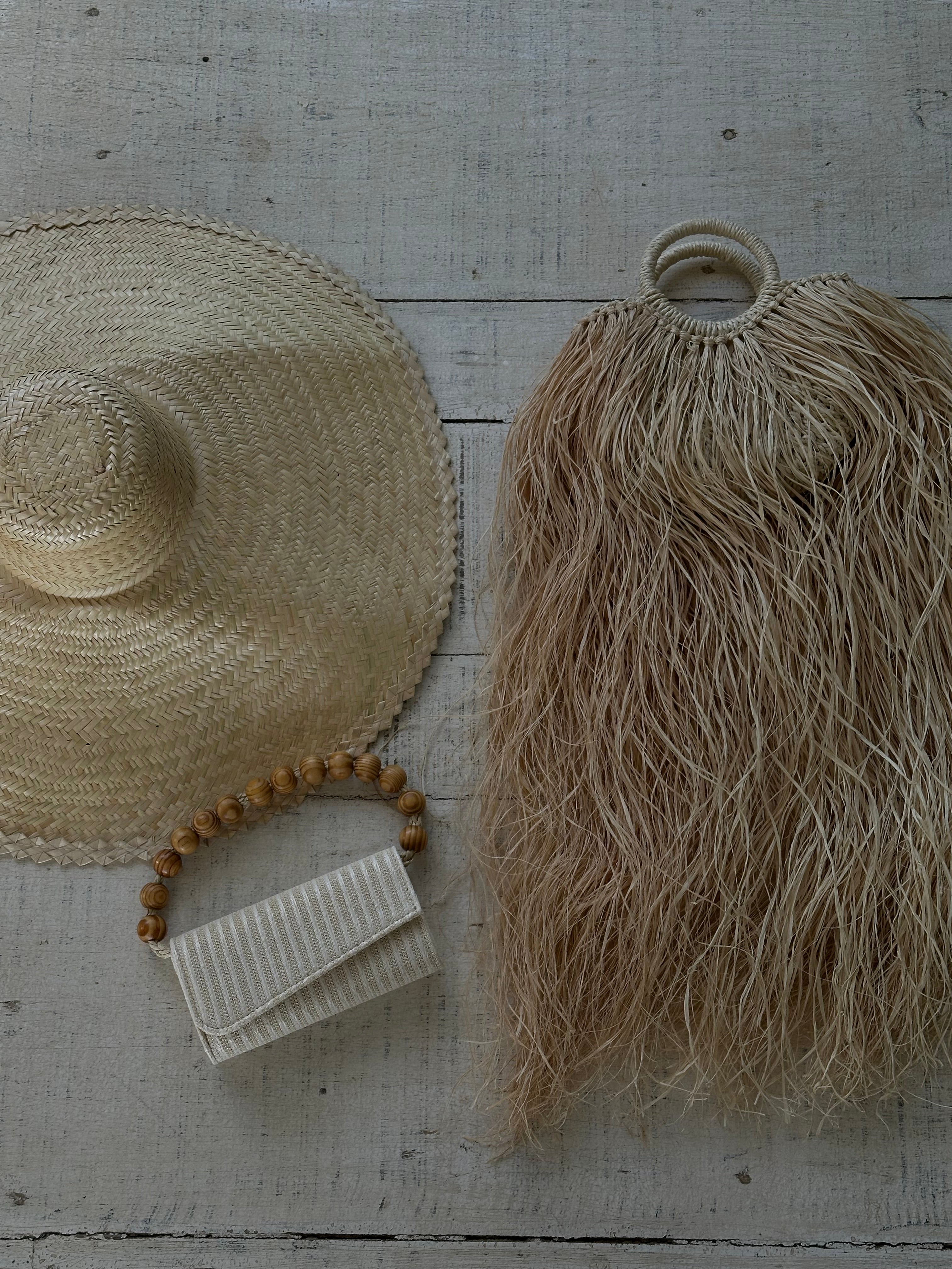 Chapéus amplos e bolsas em palha natural: a dupla perfeita para um beachwear elegante. Descubra a coleção que celebra o sol com estilo e sofisticação artesanal.